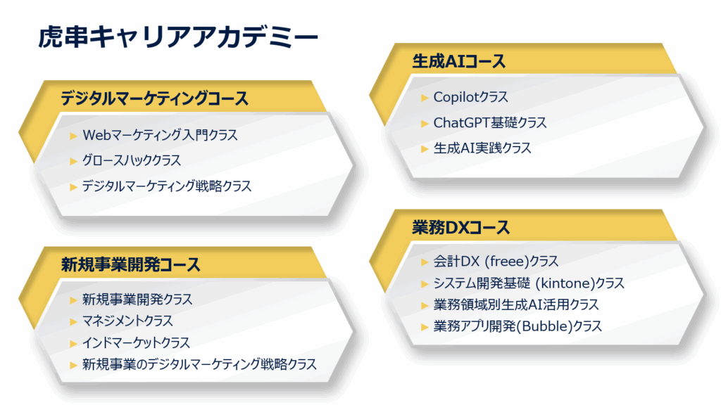 - 多岐にわたるビジネススキルとツールの実践的な学習内容